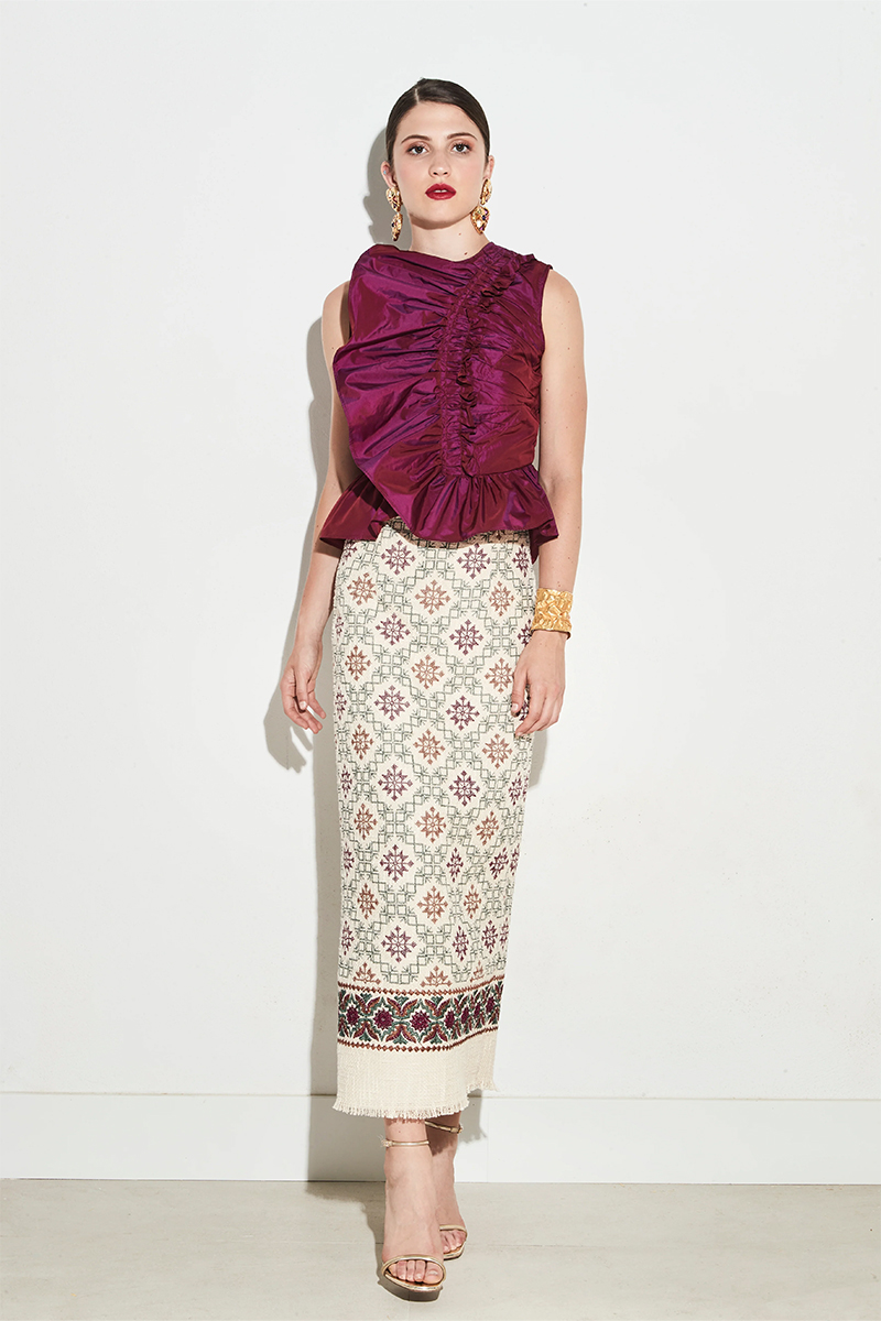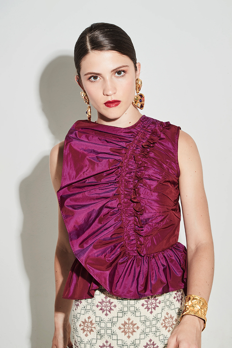 Camisa de tafetán en tono burdeos y diseño sin mangas. Presenta escote cerrado y un volante frontal que aporta movimiento y volumen, con bajo de caída amplia. Cierre con cremallera invisible.