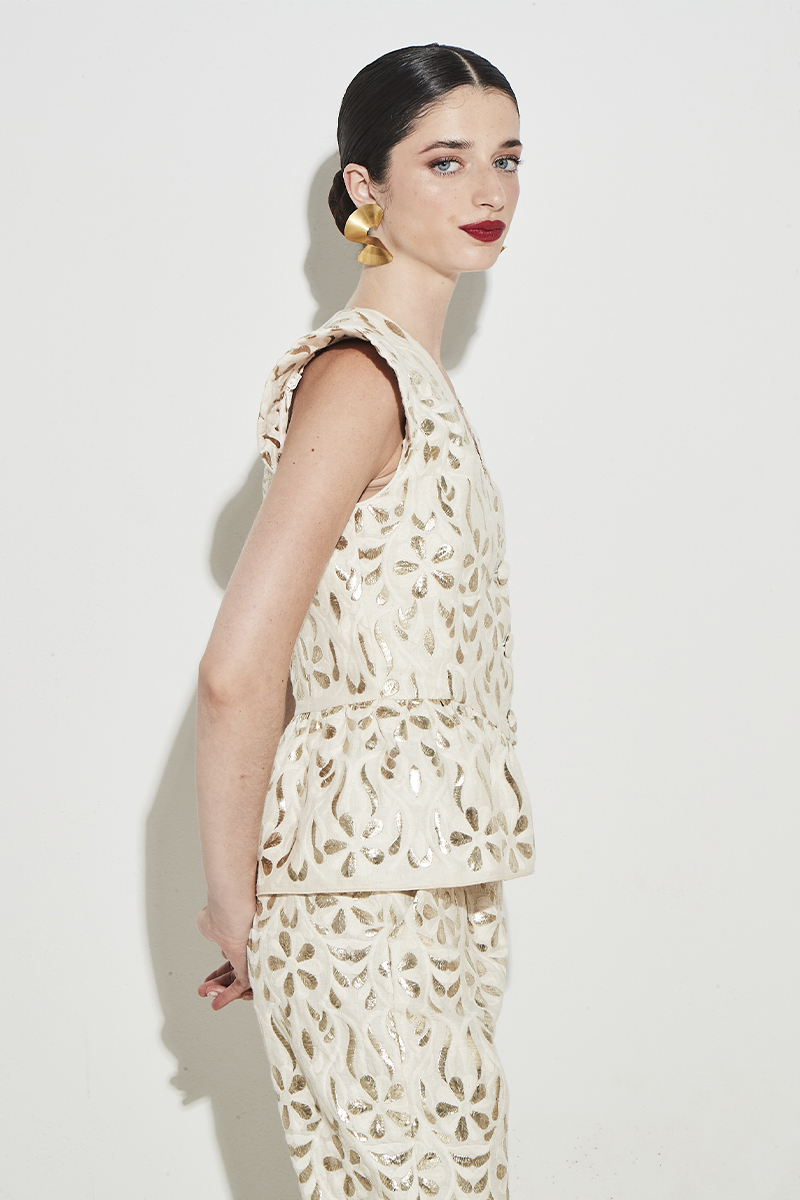 Conjunto compuesto por chaqueta y pantalón en tejido bordado con motivos florales dorados en relieve sobre fondo crudo.