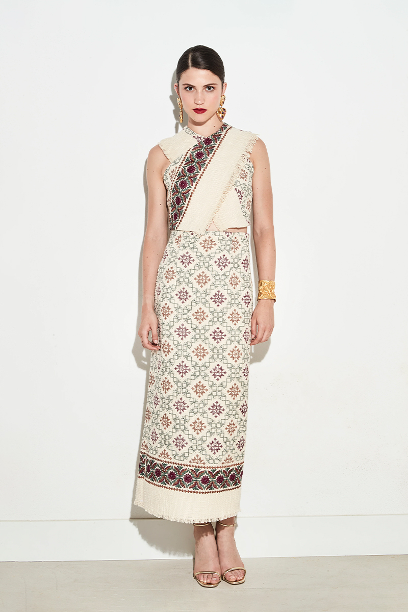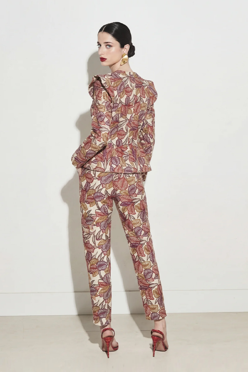 Conjunto compuesto por chaqueta y pantalón en tejido bordado con estampado floral en tonos rojizos y mostaza sobre fondo claro.