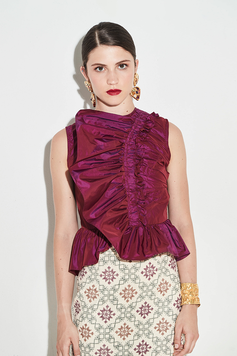 Chaqueta con escote en pico y hombros ligeramente marcados, que incorpora mangas desmontables mediante cremallera invisible, permitiendo transformar la prenda.