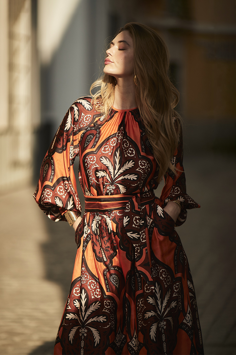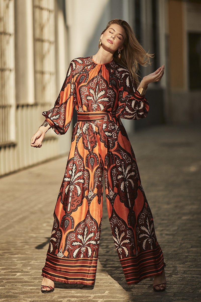 Conjunto compuesto por camisa y pantalón a juego con estampado en tonos cálidos rojizos y negros.