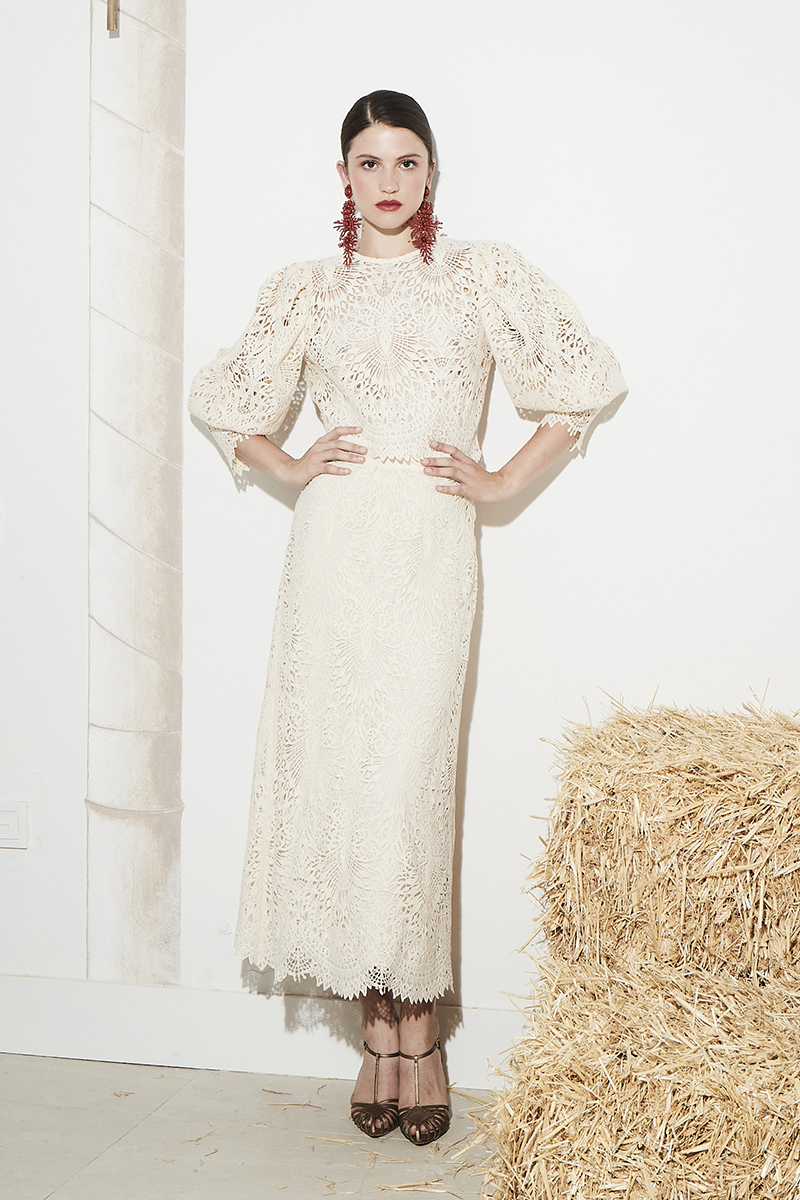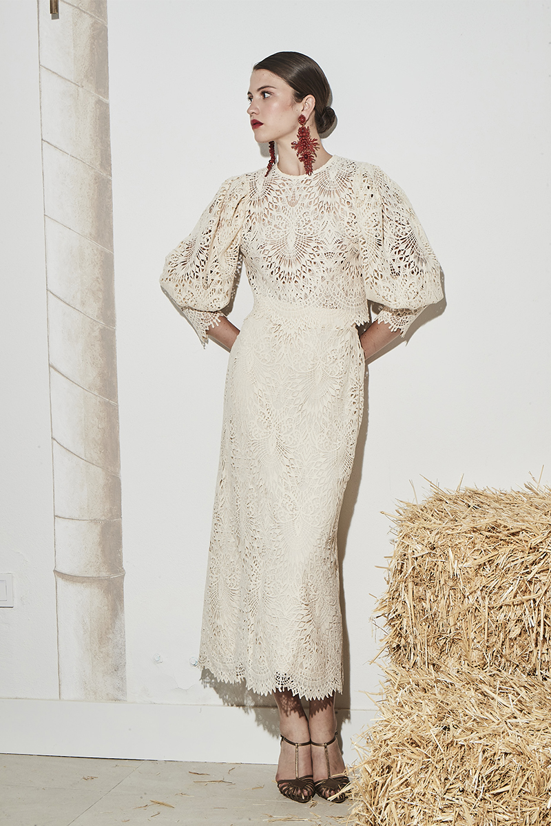 Conjunto compuesto por camisa y falda en tejido guipur con motivo floral.