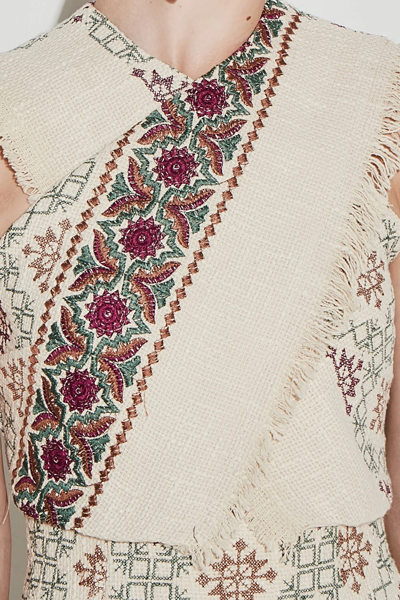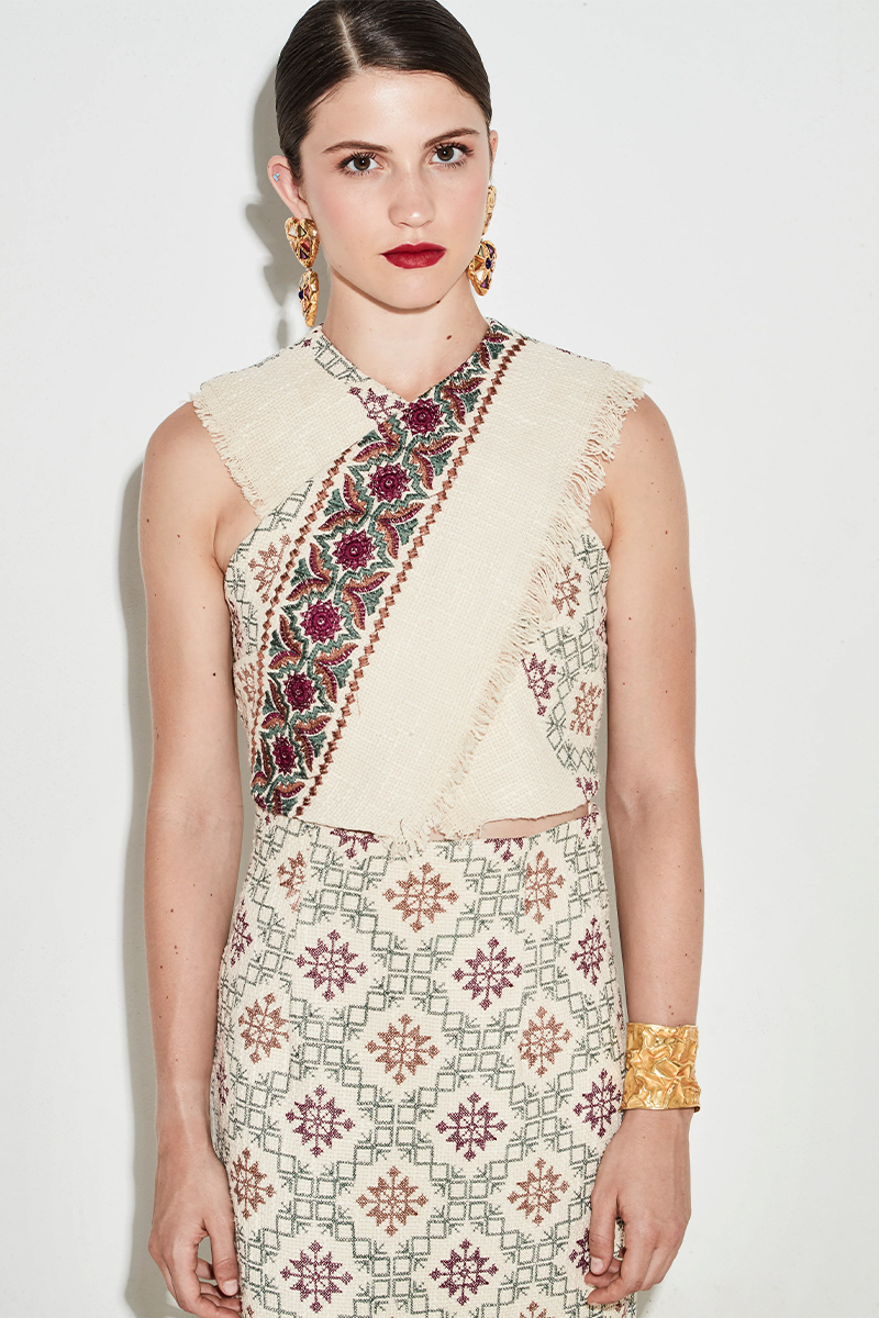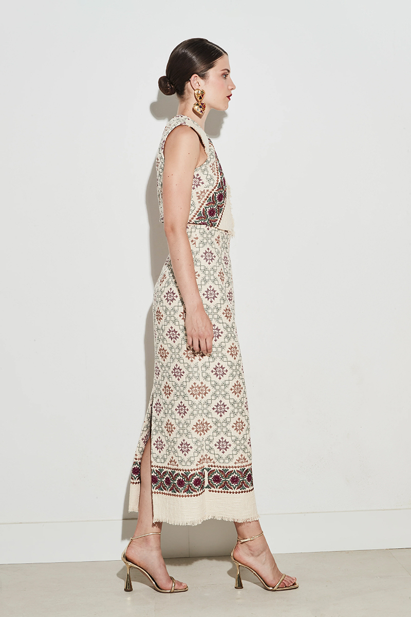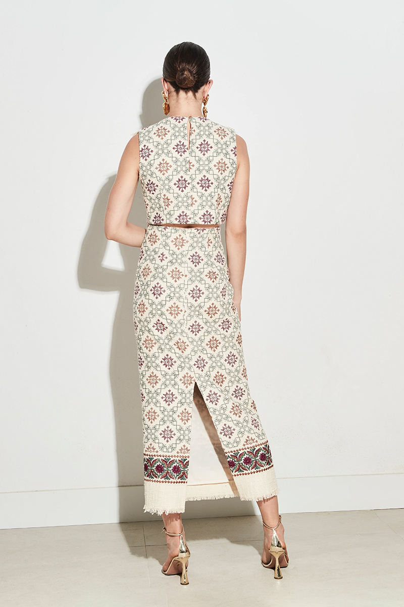 Conjunto formado por camisa y falda a juego en tejido rústico con bordado de punto de cruz. Tono crudo con estampado geométrico en tonos rosados y verdes.