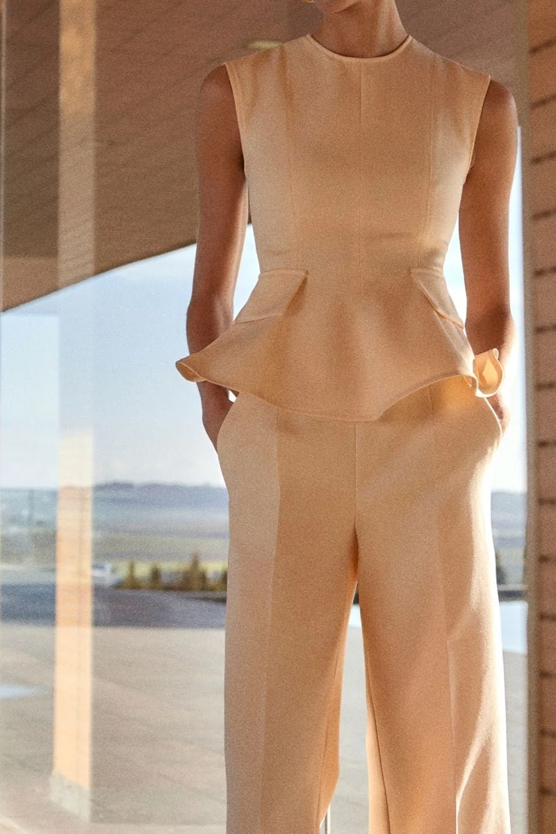 Conjunto compuesto por pantalón y top en tono crema.