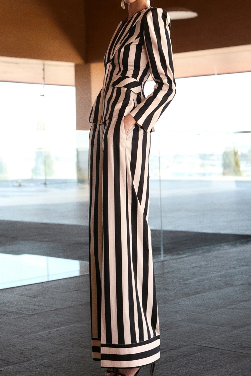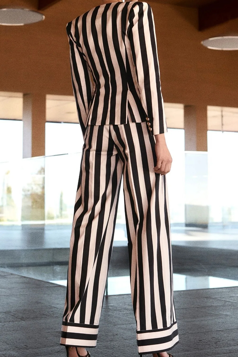 Conjunto compuesto por chaqueta y pantalón a juego en estampado de rayas blancas y negras.