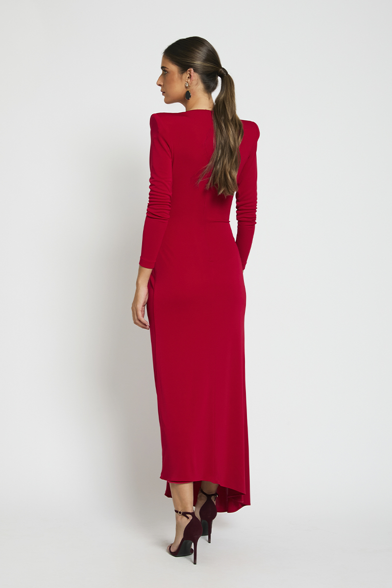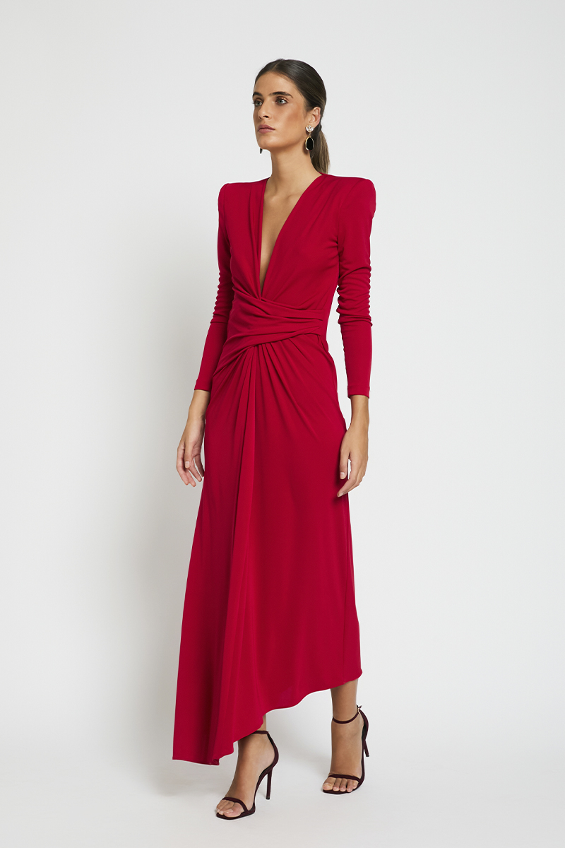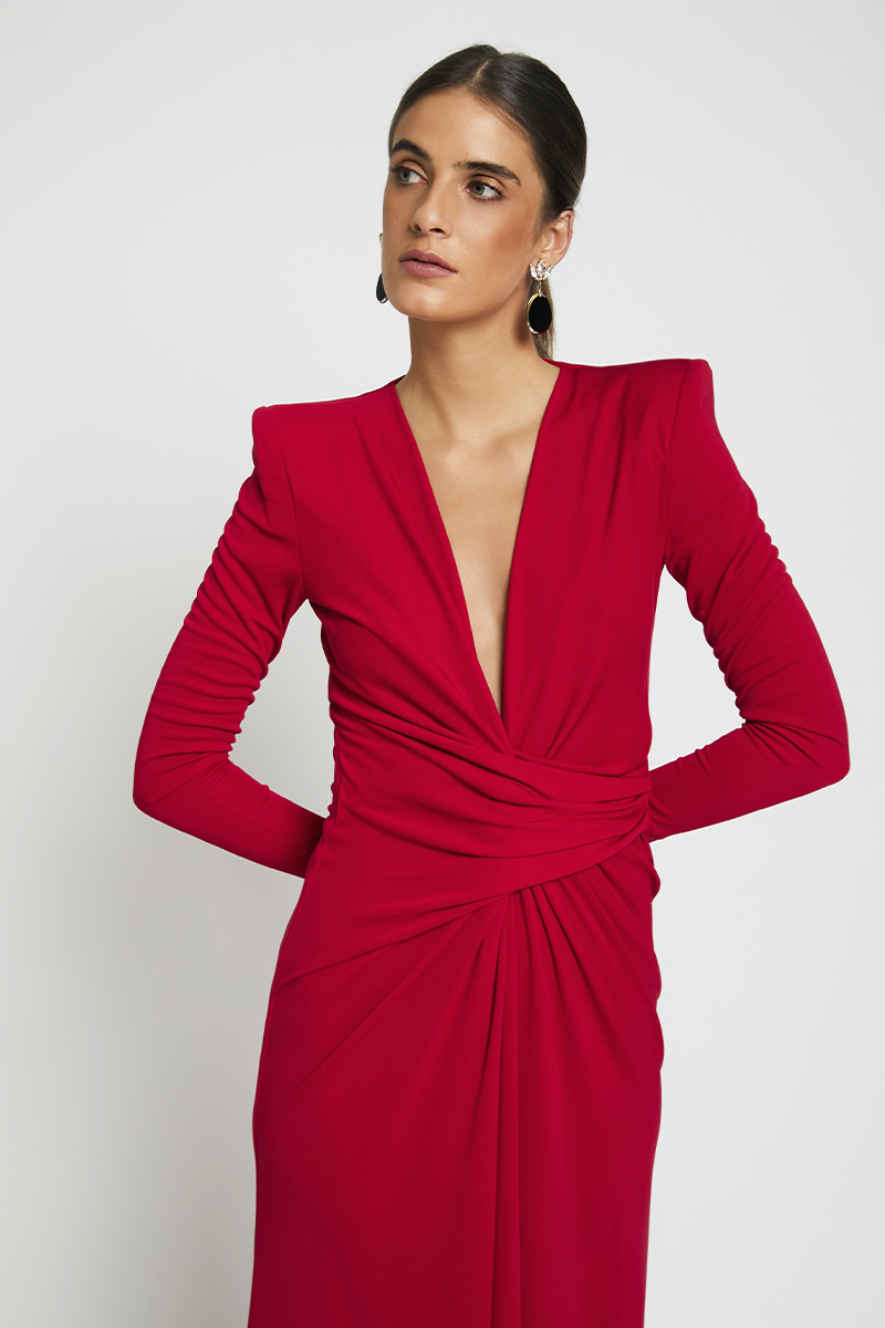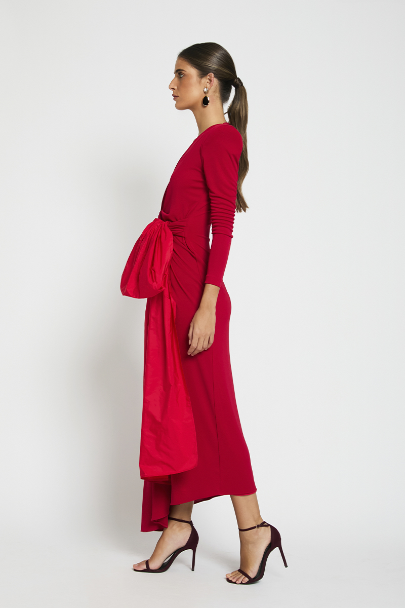 Vestido en punto rojo con escote en pico y detalle de recogido en la parte delantera. Incluye lazo de tafetán desmontable que permite personalizar el look según el evento. Su corte estiliza la figura, realza el pecho y se adapta cómodamente al cuerpo.