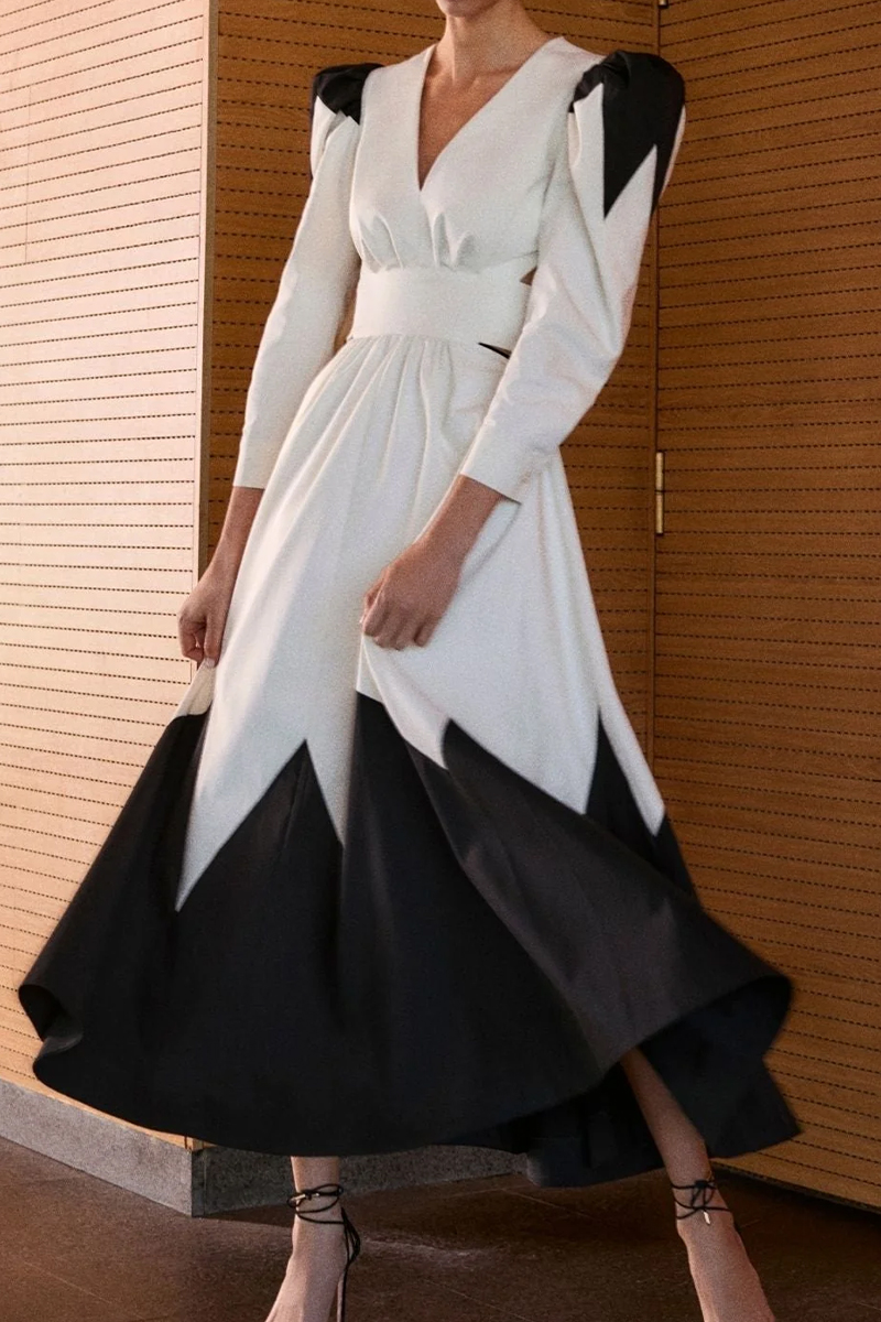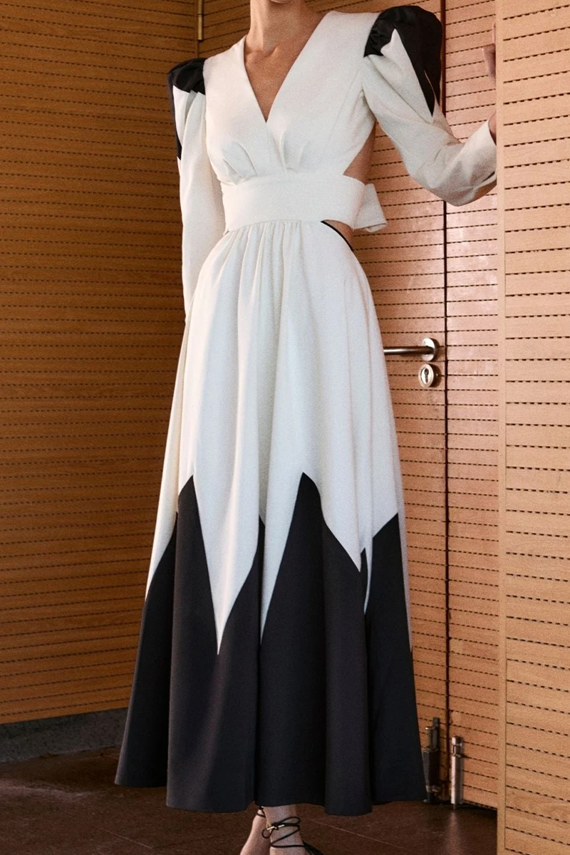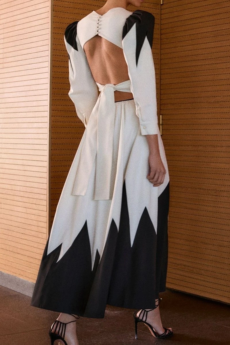 Vestido en color crudo con detalles en negro, mangas abullonadas y escote en pico. Presenta aberturas laterales, espalda abierta con cierre trasero en el cuello y lazada trasera, aportando elegancia y movimiento.