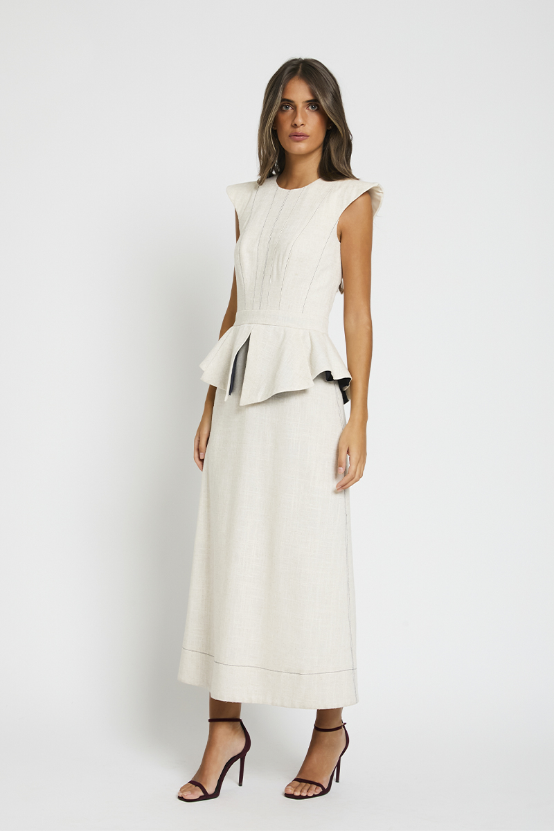 Vestido midi confeccionado en lino con escote en pico y peplum que realza la cintura. Su corte entallado y la textura natural del tejido crean una silueta femenina y elegante, ideal para celebraciones diurnas o looks de temporada. Versátil y cómodo, es una opción favorecedora para eventos familiares.