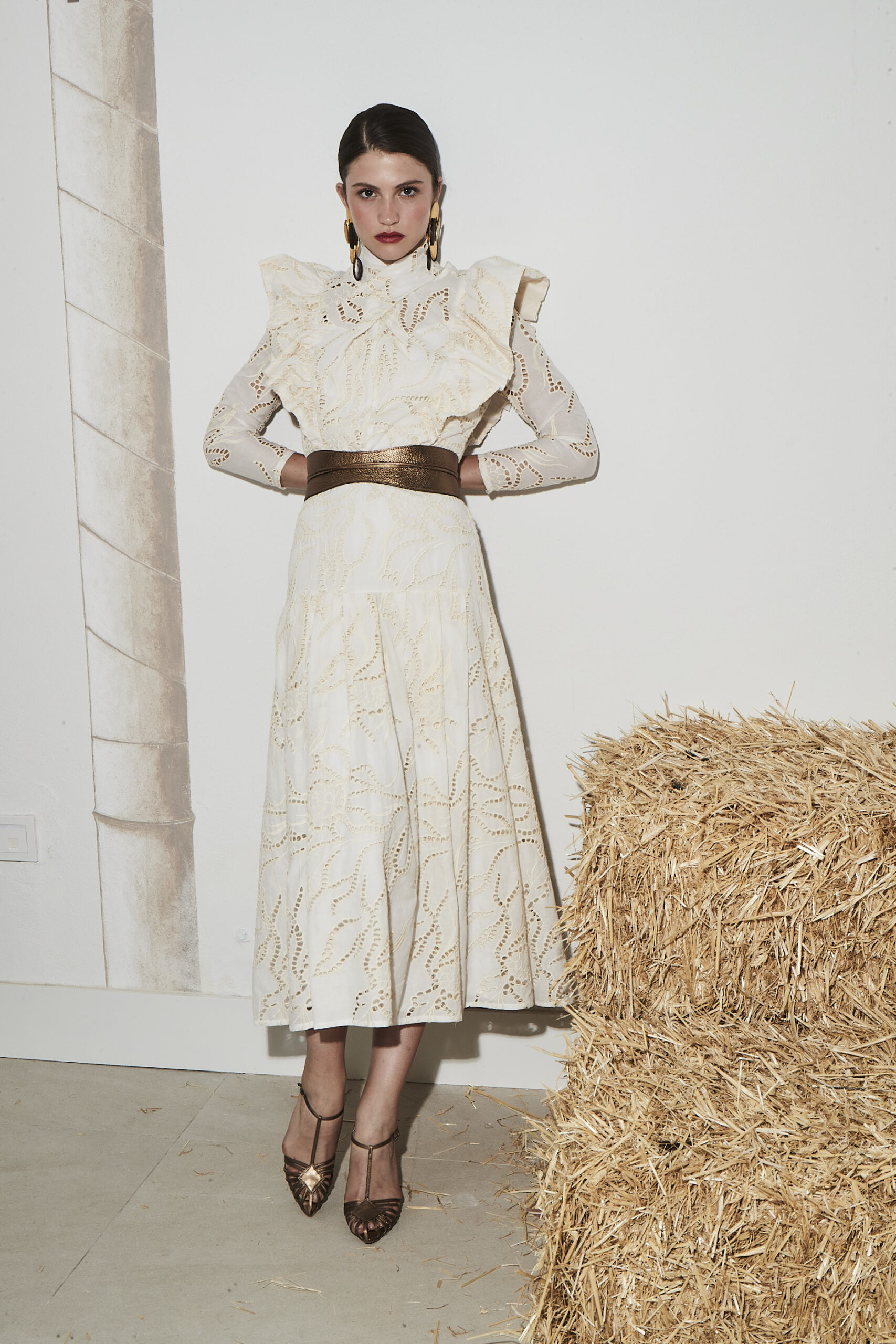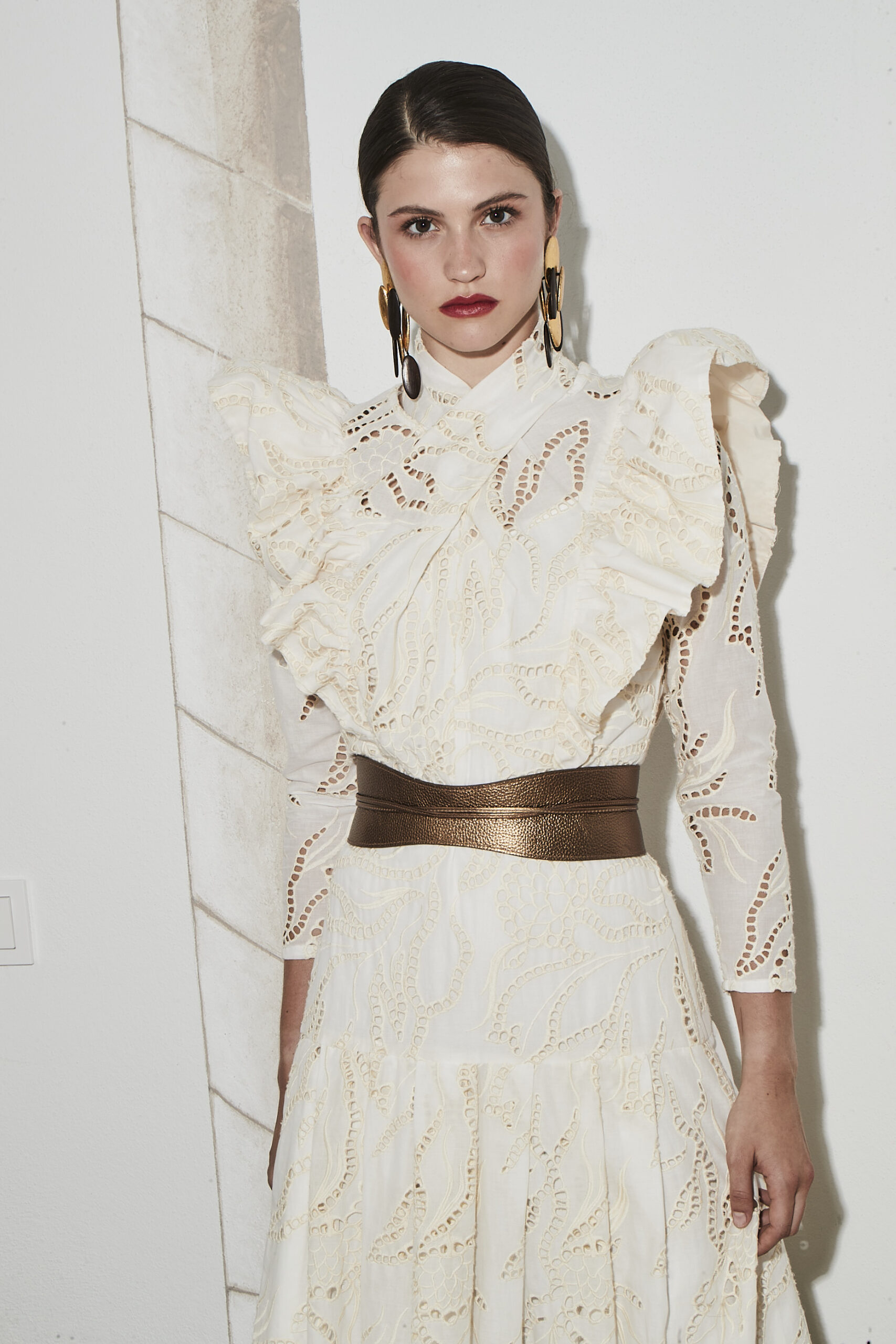 Vestido en tejido bordado calado con un delicado diseño floral que aporta textura. Destaca por su cuello cerrado y volantes estructurados en hombros y pecho que realzan la silueta.